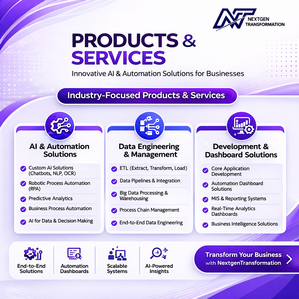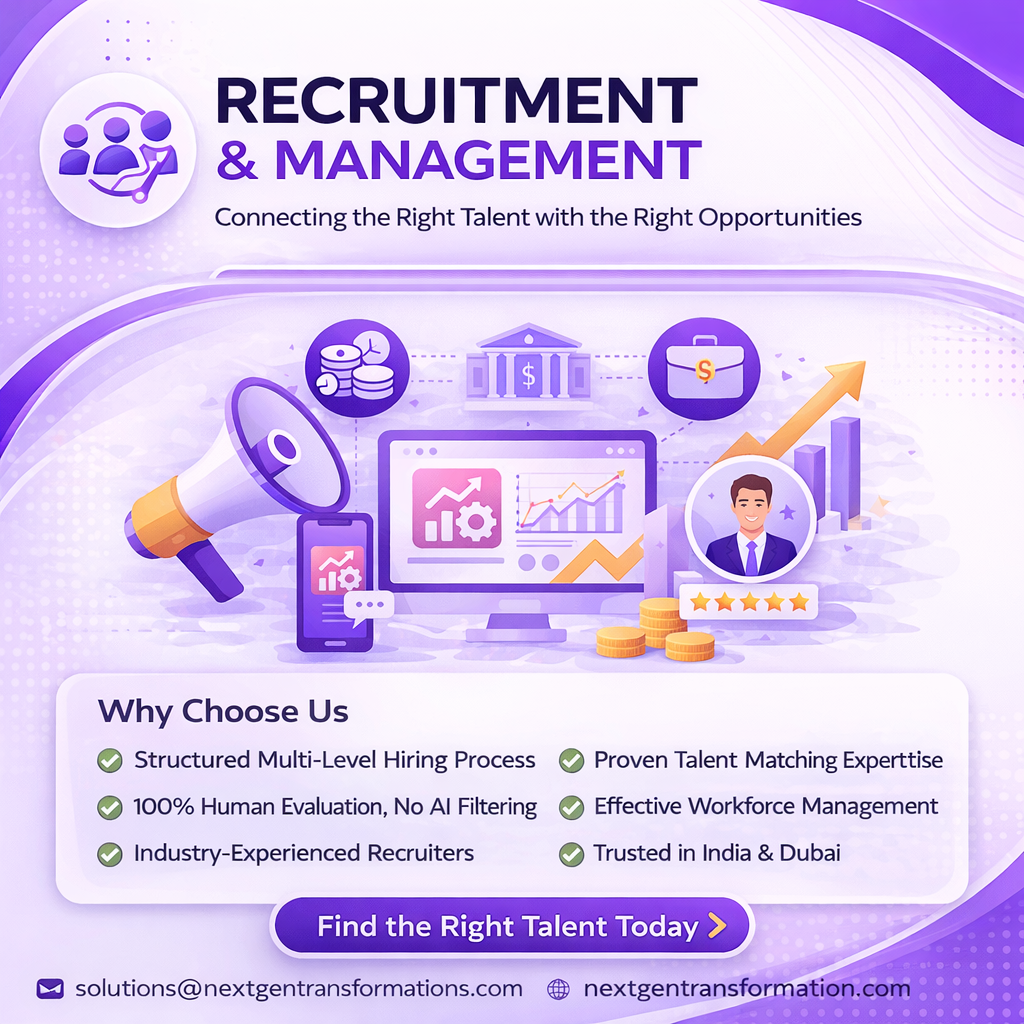 NextgenTransformation is a forward-thinking organization committed to empowering professionals and businesses through innovation, advanced technology, and industry-driven expertise. We specialize in delivering high-impact learning and development programs, cutting-edge AI and automation solutions, and strategic recruitment services tailored to meet evolving industry demands. Our approach focuses on bridging the gap between talent and technology, enabling individuals to build future-ready skills while helping organizations scale with efficiency and intelligence. With strong experience across corporate and university collaborations, we bring practical knowledge, real-world applications, and measurable results. Our team of experts ensures that every solution is designed to create value, enhance productivity, and drive long-term success.