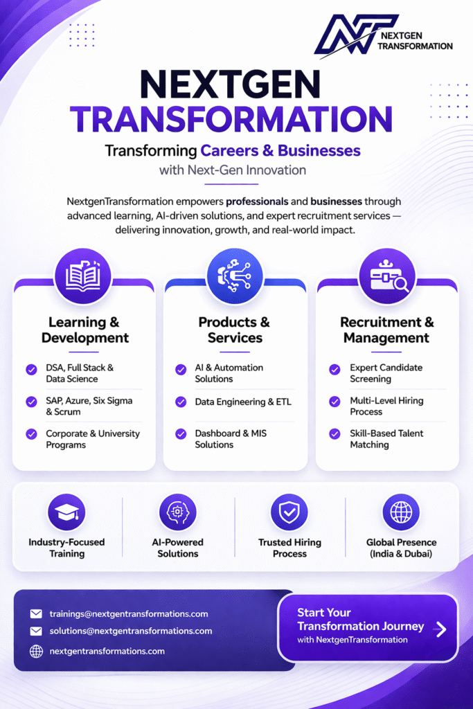 NextgenTransformation is a forward-thinking organization committed to empowering professionals and businesses through innovation, advanced technology, and industry-driven expertise. We specialize in delivering high-impact learning and development programs, cutting-edge AI and automation solutions, and strategic recruitment services tailored to meet evolving industry demands. Our approach focuses on bridging the gap between talent and technology, enabling individuals to build future-ready skills while helping organizations scale with efficiency and intelligence. With strong experience across corporate and university collaborations, we bring practical knowledge, real-world applications, and measurable results. Our team of experts ensures that every solution is designed to create value, enhance productivity, and drive long-term success.